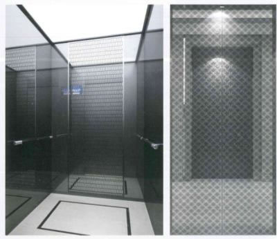 轎壁:后壁中間黑鈦金鏡面蝕刻兩側(cè)黑鈦鏡面不銹鋼,側(cè)壁黑鈦鏡面不銹鋼,底部黑鈦發(fā)紋不銹鋼踢腳線